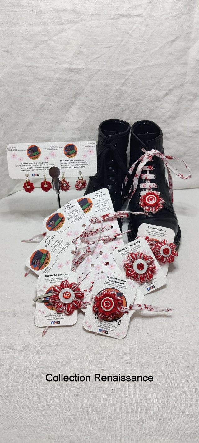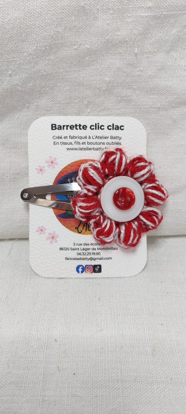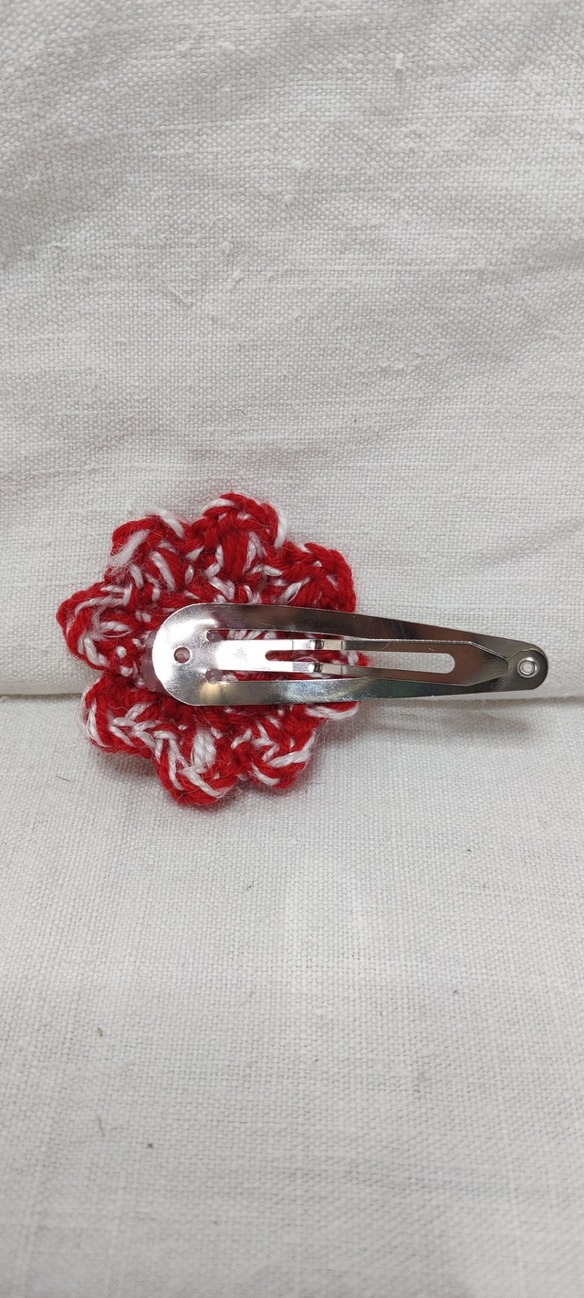 Chaque fleur est crochetée à la main, puis je lui ajoute un cœur unique : deux boutons choisis pour leur histoire, leur couleur ou leur fantaisie. Enfin, elle se pose délicatement sur son support — clic-clac (pince 6cm de long, fleur 5cm de diamètre, longueur totale7,3cm) — prête à illuminer vos coiffures.