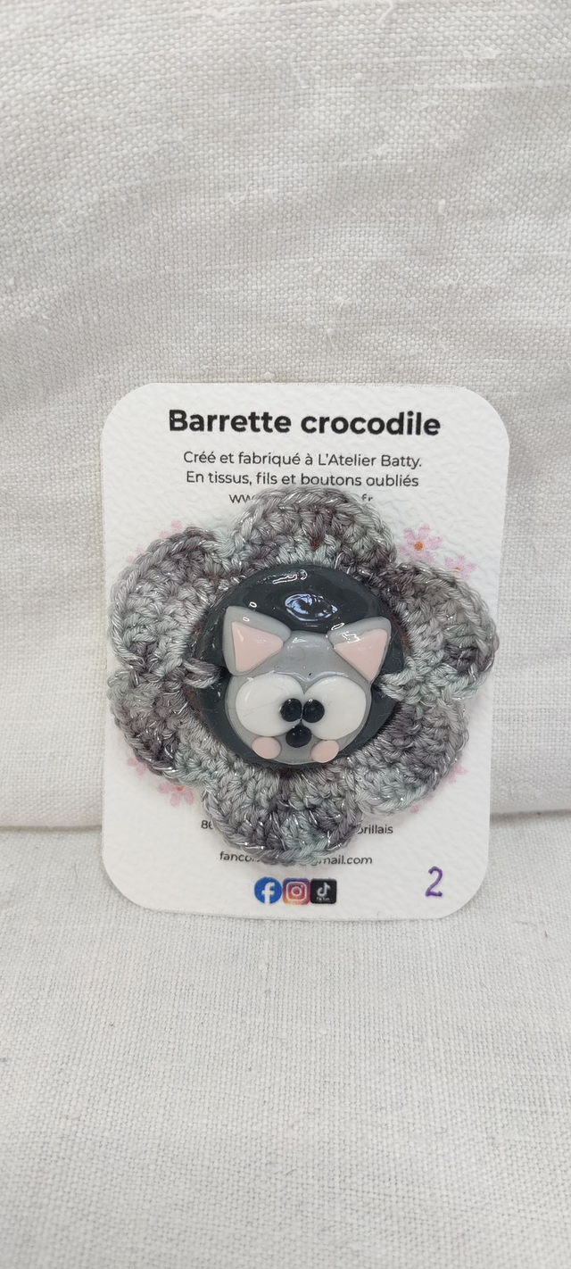 Cette barrette pince crocodile n'attend que toi ! Avec sa fleur crochetée et son chat modelé en pâte polymère à la main, elle est conçue pour égayer ta coiffure ou ta tenue avec fantaisie.