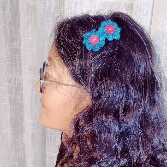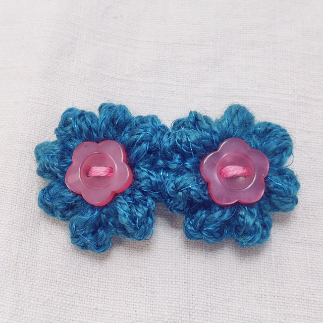Chaque fleur est crochetée à la main, puis je lui ajoute un cœur unique : un ou deux boutons choisis pour leur histoire, leur couleur ou leur fantaisie. Enfin, elle se pose délicatement sur son support — pince crocodile (4.5cm de diamètre), clic-clac (8cm de long, fleur 4.5cm de diamètre) ou pince plate (6cm de long) — prête à illuminer vos coiffures.
