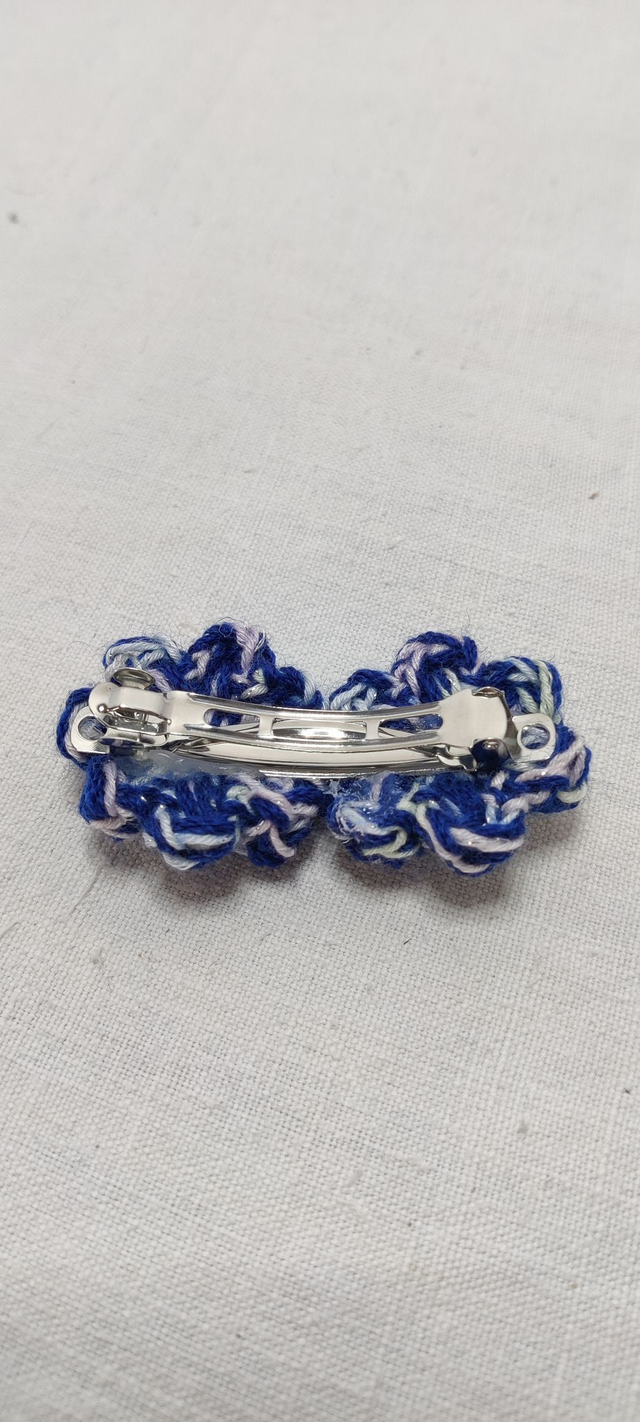 Deux fleurs pomponettes Bleu Marine et Arc En Ciel Pastel, délicatement crochetées à la main, prennent place sur une barrette plate pour composer un duo tendre et végétal. En leur cœur, deux boutons blancs nacrés apportent une touche de lumière et un contraste pétillant.