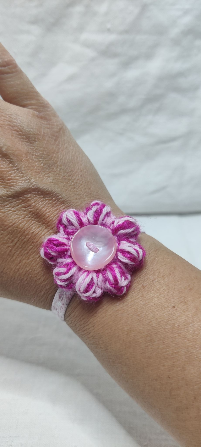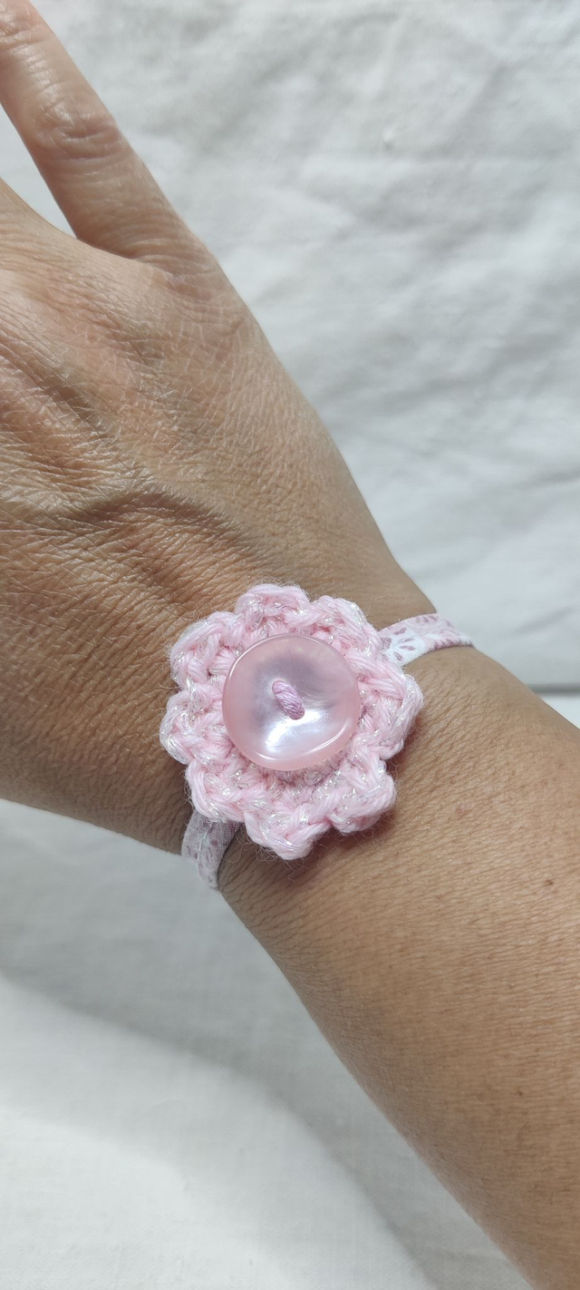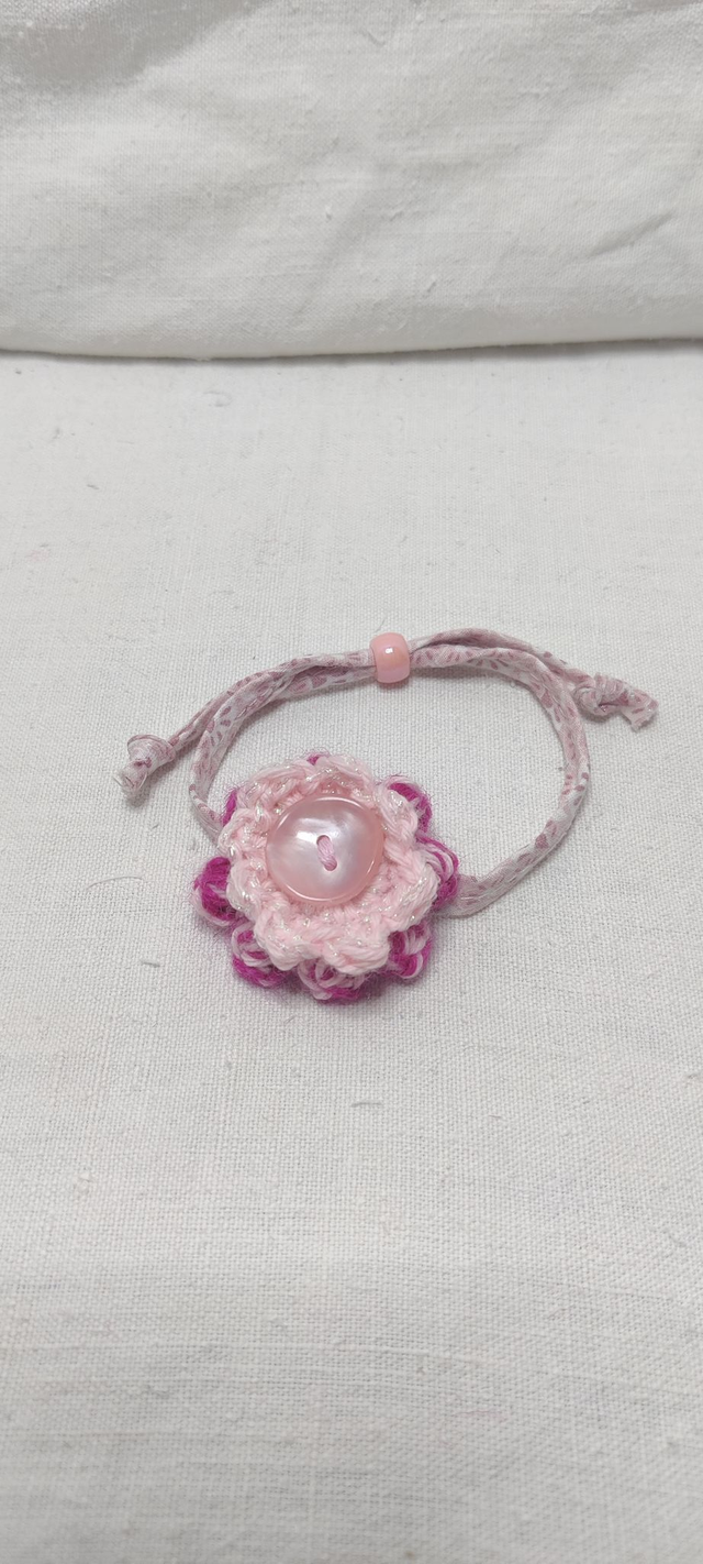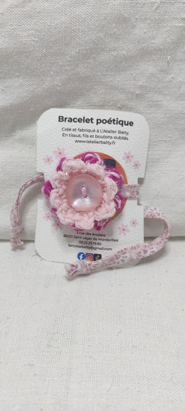 Un lacet de tissus cousu main, doux et léger vient enlacer ton poignet comme un petit ruban porte bonheur. Il est orné d'un bouton nacré soigneusement chiné auquel s'accrochent une ou deux fleurs interchangeables crochetées à la main, délicates et pleines de charme.