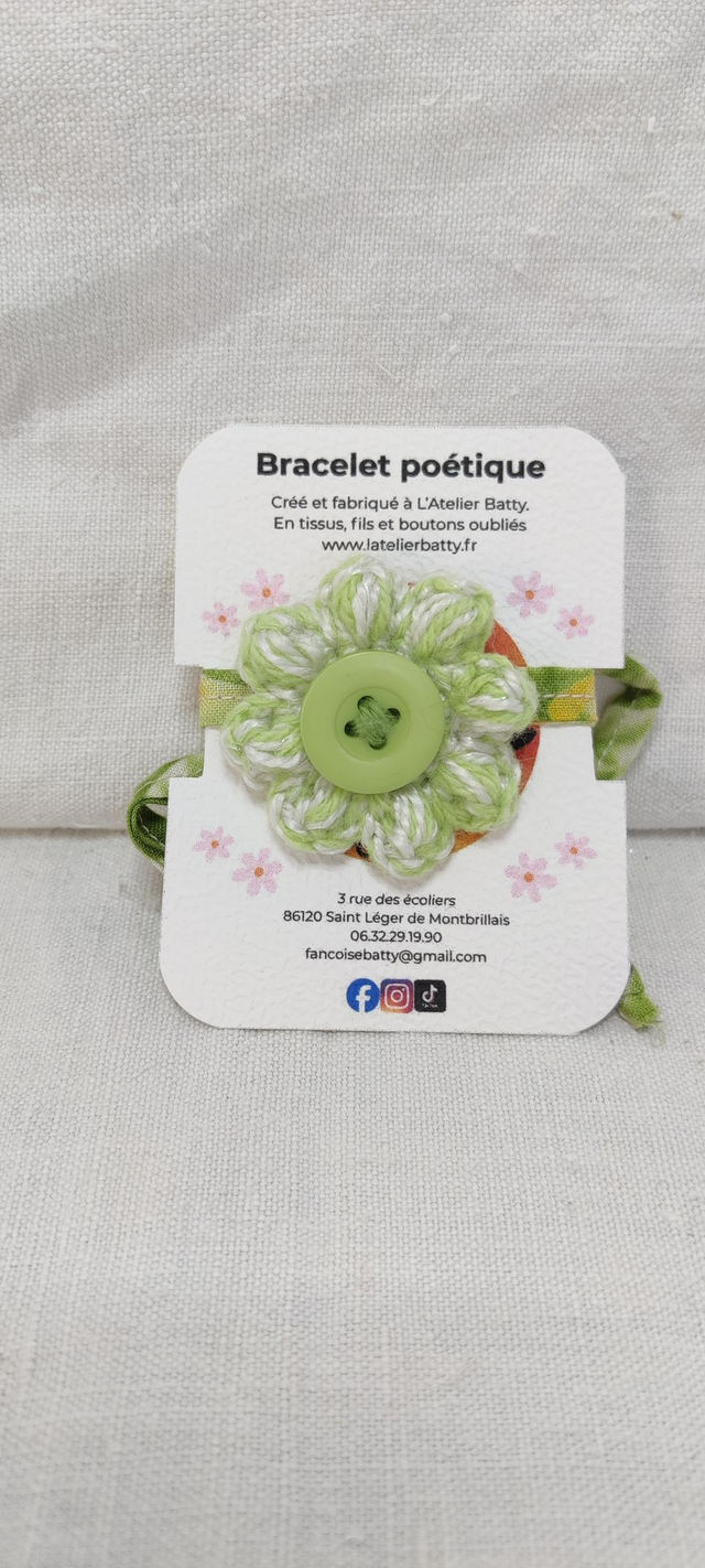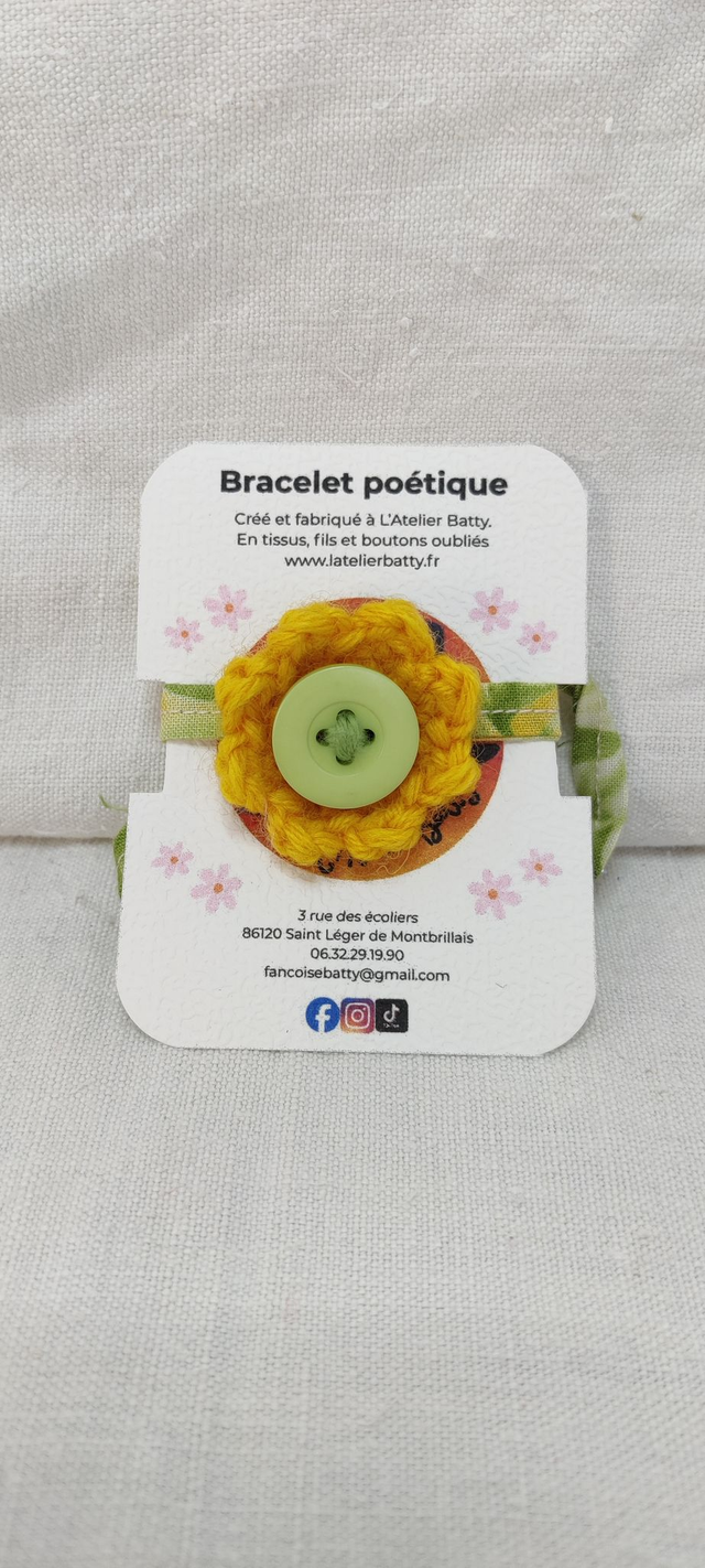 Réalisé à la main dans mon atelier, il associe un ruban vert et jaune (0.8cm de large) issu d’un tissu chiné, un bouton assorti ( 1.8cm) fixé avec un fil coton tressé, une fleur pomponette crochetée (4.5cm) et une fleur anémonette (3.5cm) qui sont modulables.( Les tissus et les fils étant chinés, leur composition reste aléatoire, coton, acrylique ou laine)