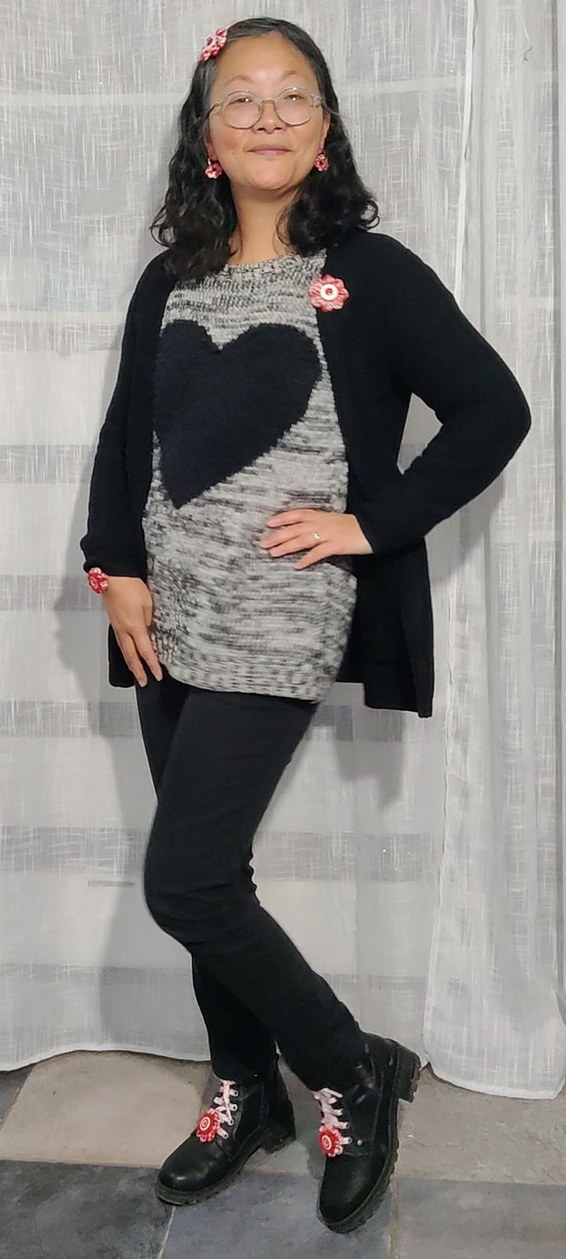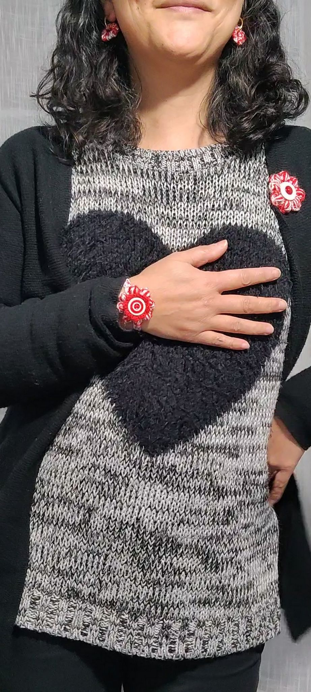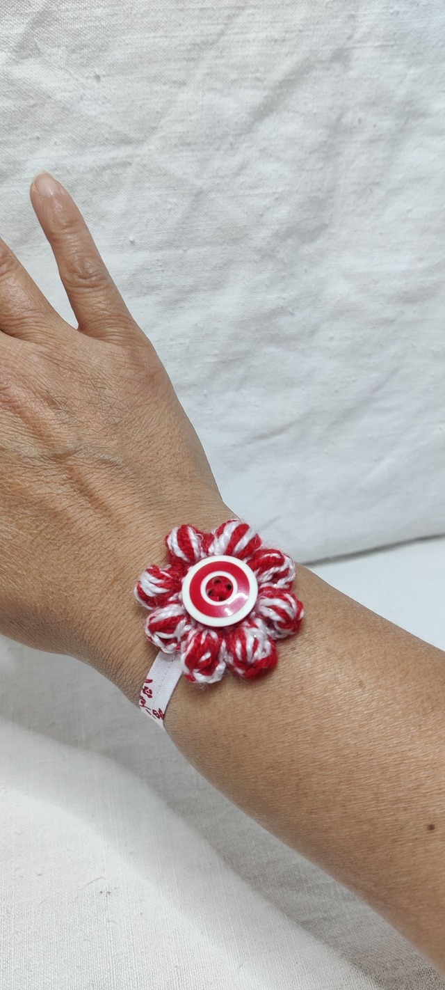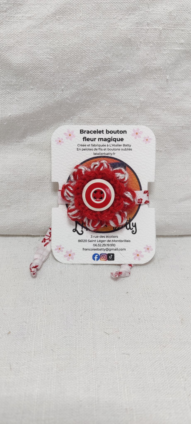 Réalisé à la main dans mon atelier, il associe un ruban rouge et blanc (0.8cm de large) issu d’un tissu chiné, un bouton assorti ( 1.8cm) fixé avec un fil coton tressé, une fleur pomponette crochetée (4cm) et une fleur anémonette (3cm) qui sont modulables.( Les tissus et les fils étant chinés, leur composition reste aléatoire, coton, acrylique ou laine)