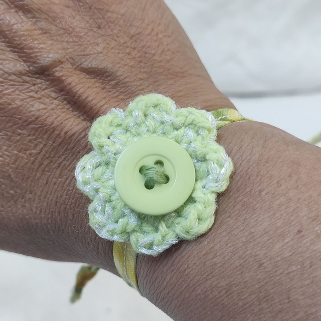 Réalisé à la main dans mon atelier, il associe un ruban vert noisette (0.8cm de large) issu d’un tissu chiné, un bouton assorti ( 1.8cm) fixé avec un fil coton tressé, et une fleur crochetée (3.7cm) avec soin.( Les tissus et les fils étant chinés, leur composition reste aléatoire, coton, acrylique ou laine)