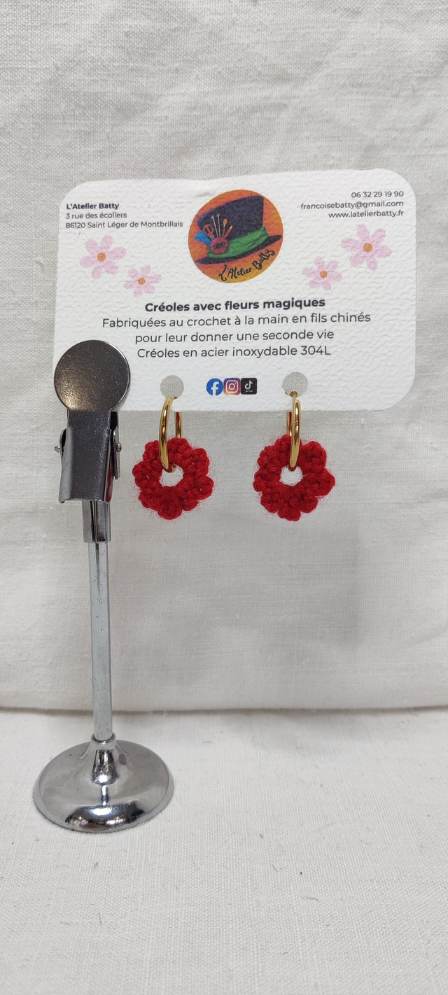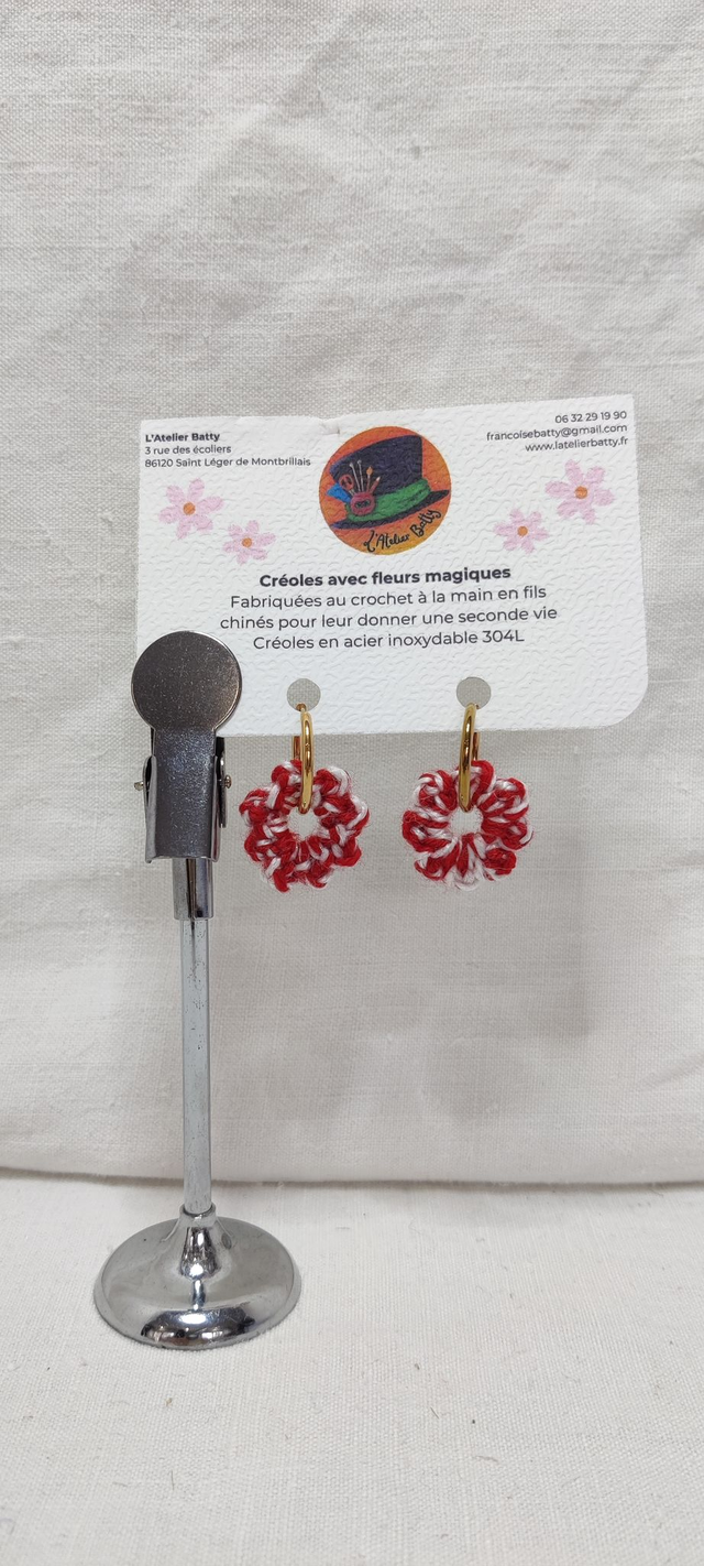 Ces créoles dorées de 2cm de diamètre en acier inoxydable 304L ornées de pampilles fleurs rouges et blanches de 2.5cm ou rouges de 2.3cm crochetées avec soin à la main en fils chinés dans mon atelier.