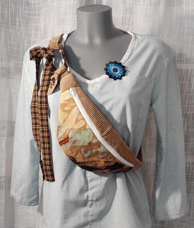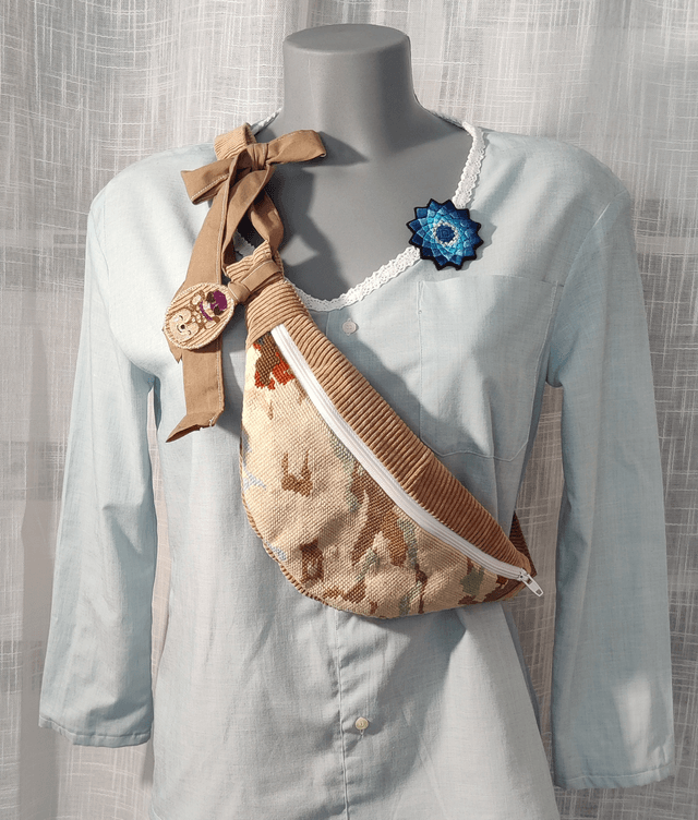 Ces sacs bananes uniques sont cousus à partir d’une jupe en velours (dont la poche se glisse au dos pour accueillir mouchoirs ou trésors), d’un canevas chiné pour le devant, et d’une chemise douce en doublure intérieure ♻️🧵
