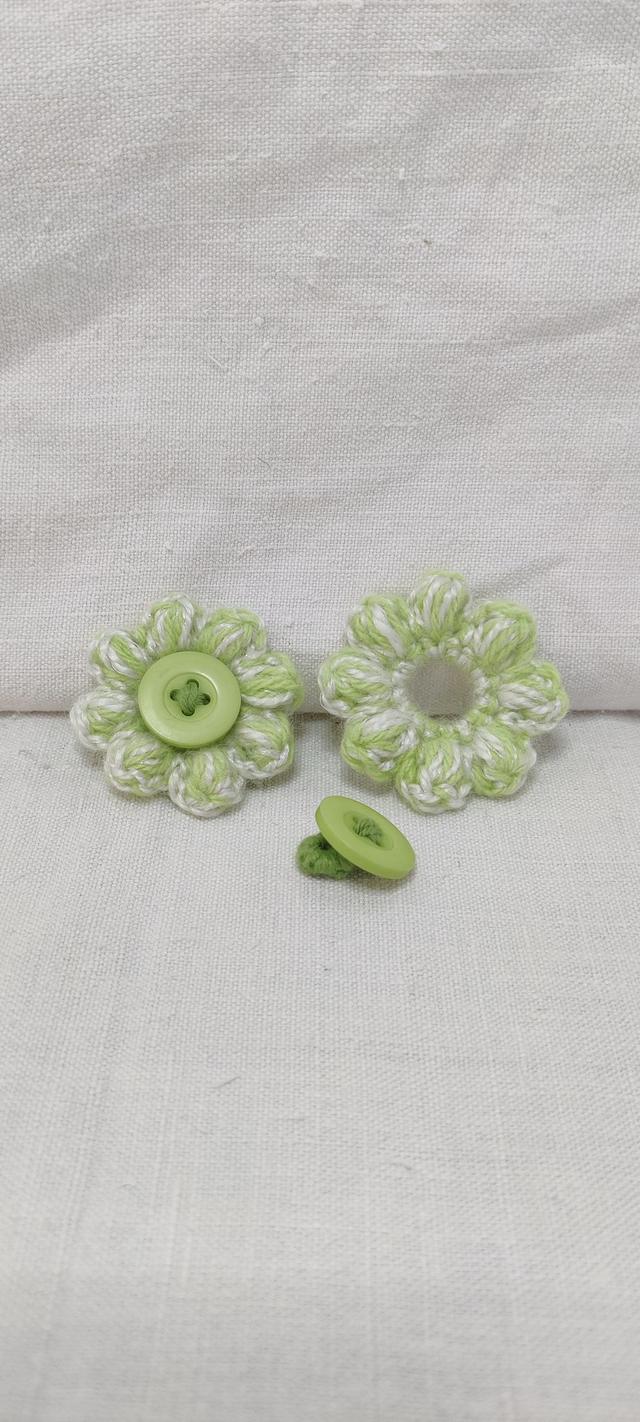 Fleurs pampilles pomponettes vert amande et blancs paillettes : 4,5cm de diamètre