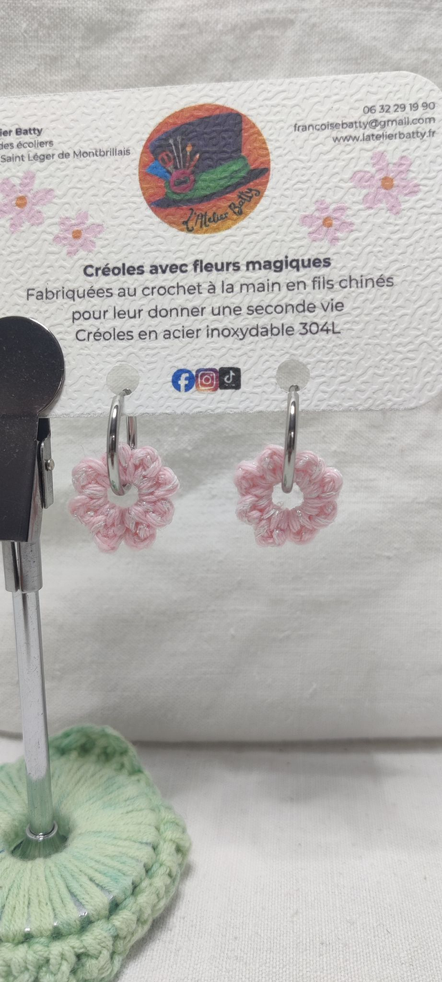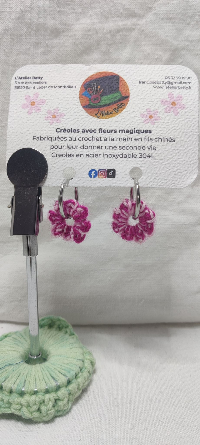 Ces créoles argentées de 2cm de diamètre en acier inoxydable 304L ornées de pampillettes fleurs rose clair de 2.5cm ou rose fushia de 2.5cm crochetées avec soin à la main en fils chinés dans mon atelier.