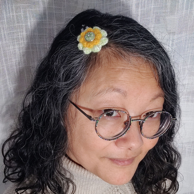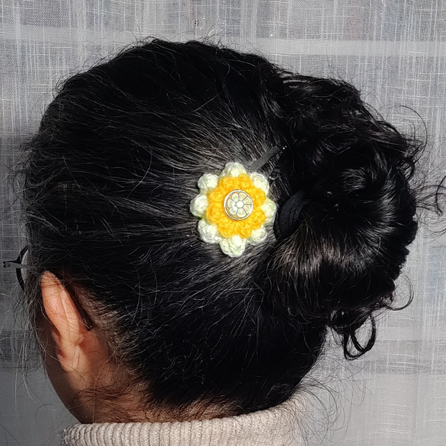 Un joli bouton chiné trouve ici une nouvelle vie en se nichant au cœur de ces deux fleurs crochetées à la main. Son délicat motif floral s'accorde à merveille avec les teintes douces et lumineuses des fils pour illuminer ta coiffure avec poésie.