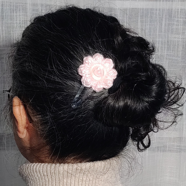 Avec son adorable petit bouton rose pastel en forme de cœur et sa délicate fleur pomponette crochetée à la main mêlant des tons doux et lumineux rose et blanc, cette barrette à pince clic clac est parfaite pour sublimer une coiffure romantique pleine de tendresse et de délicatesse.