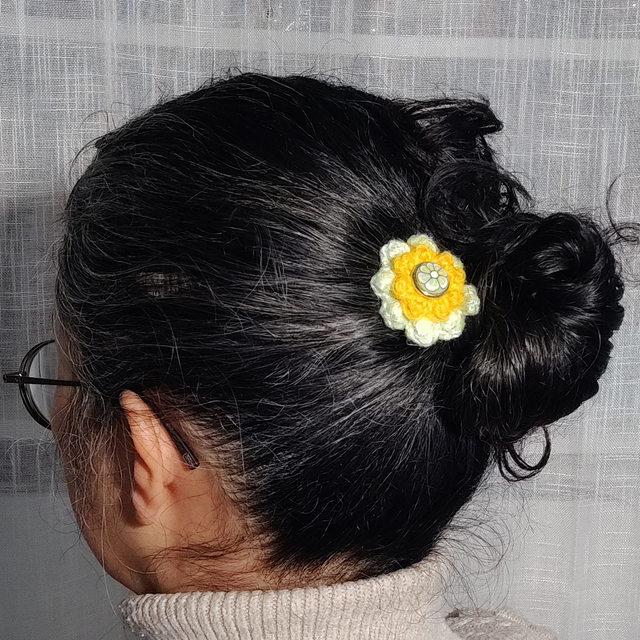 Un joli bouton chiné trouve ici une nouvelle vie en se nichant au cœur de ces deux fleurs crochetées à la main. Son délicat motif floral s'accorde à merveille avec les teintes douces et lumineuses des fils pour illuminer ta coiffure ou ta tenue avec poésie.