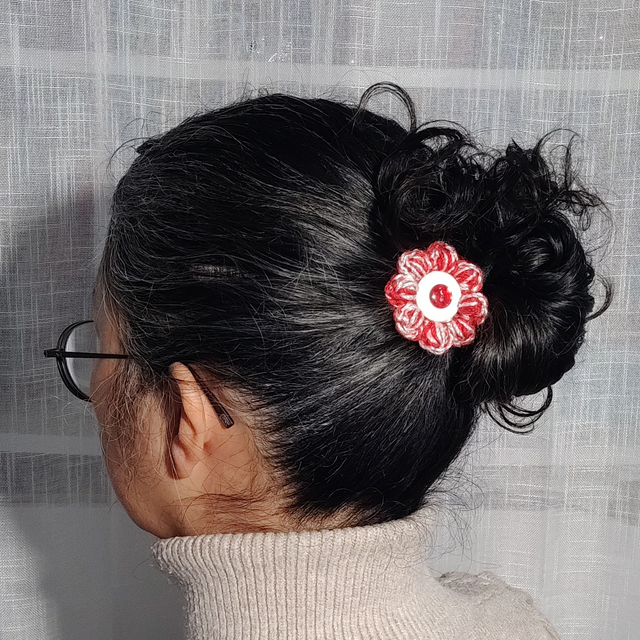 Un grand bouton blanc accompagné d'un petit bouton rouge irisé s'invite au cœur d'une fleur pomponette crochetée à la main, mêlant rouge éclatant et blanc lumineux. Ensemble, ils créent un contraste délicat et plein de caractère, parfait pour apporter une touche romantique et pétillante à ta coiffure.