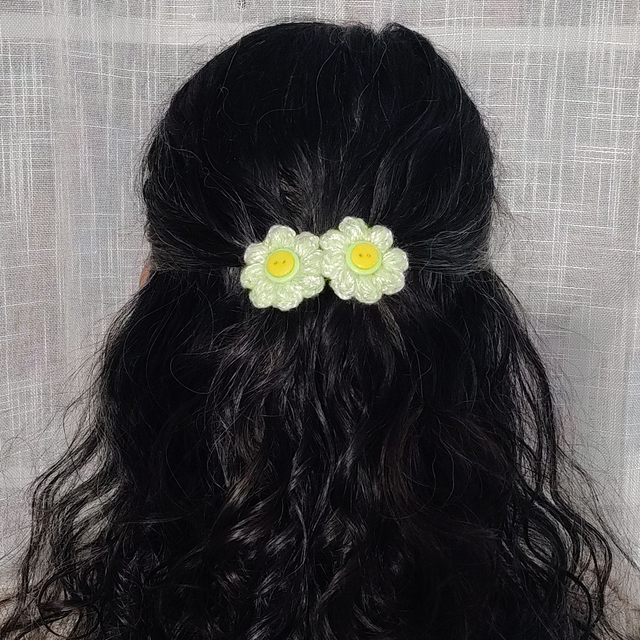 Deux fleurs pomponette vert amande, délicatement crochetées à la main, prennent place sur une barrette plate pour composer un duo tendre et végétal. En leur cœur, deux boutons vert amande sont accompagnés de deux plus petits boutons jaune citron, apportant une touche de lumière et un contraste pétillant.