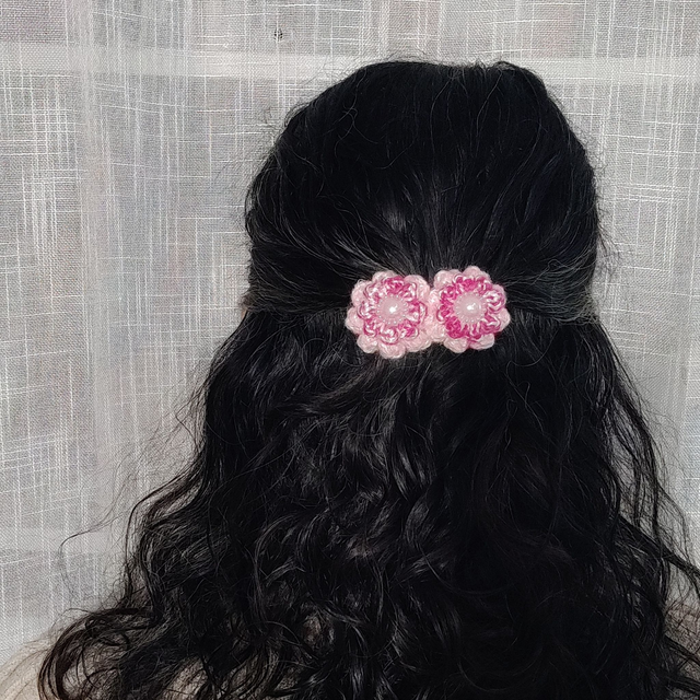 Deux fleurs pomponette rose et deux autres fleurs anémonette fushia, délicatement crochetées à la main, prennent place sur une barrette plate de la collection Parterre Rose Poudré pour composer un duo romantique. En leur cœur, deux boutons en forme de perles nacrées apportent une touche délicate.